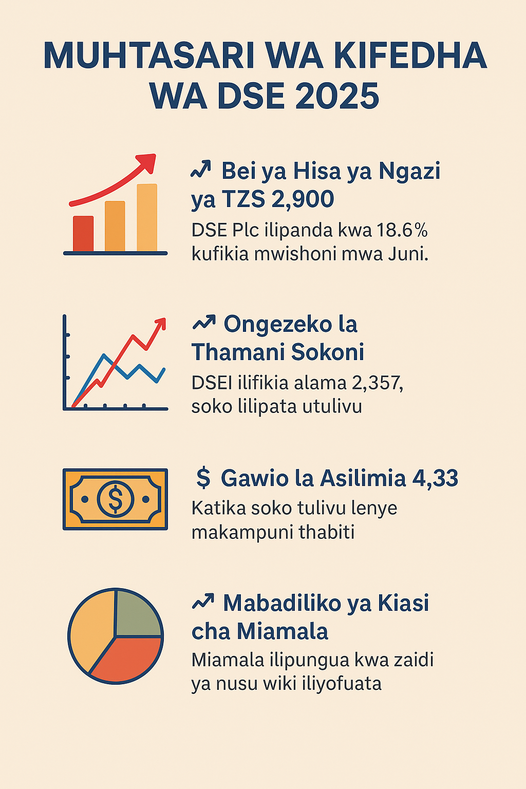 Soko la Hisa la Dar es Salaam (DSE) limeendelea kuimarika kwa mwaka 2025, likionesha dalili za ukuaji wa uchumi, mvuto kwa wawekezaji, na utulivu wa kifedha licha ya changamoto chache. Kufikia Julai 1, makampuni kadhaa yaliyosajiliwa sokoni yameendelea kutoa faida, huku thamani ya hisa na gawio kwa wanahisa ikipanda.